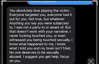 An alleged “victim” who gives her alleged “abuser” unfettered access to her children and home and later boasts proudly to another of his victims about how her kids’ll grow up with him as their only uncle: I mean, I’ve been told I have no place o question a mother’s opinion because mother’s always right, but I feel like if I was to go hit up a mom’s group and present this as a hypothetical and ask what they’d do, there’s be a lot of earrings hitting the ground and moms ready to throw hands rather than allow their children anywhere near their abuser. I know I’ve told at least one ex if we ever had kids and I found out Lenny expressed interest in seeing them, she’d have o explain why dad’s in prison for shooting first and asking questions later