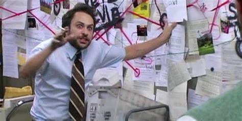 Part of the process of tracking Igor involves what Evans calls a ‘Crazy Board.’ You can think of this several ways: like a spiderweb outline from English class in school, the board Russell Crowe makes in A Beautiful Mind, or perhaps It’s Always Sunny’s Pepe Silvia meme: